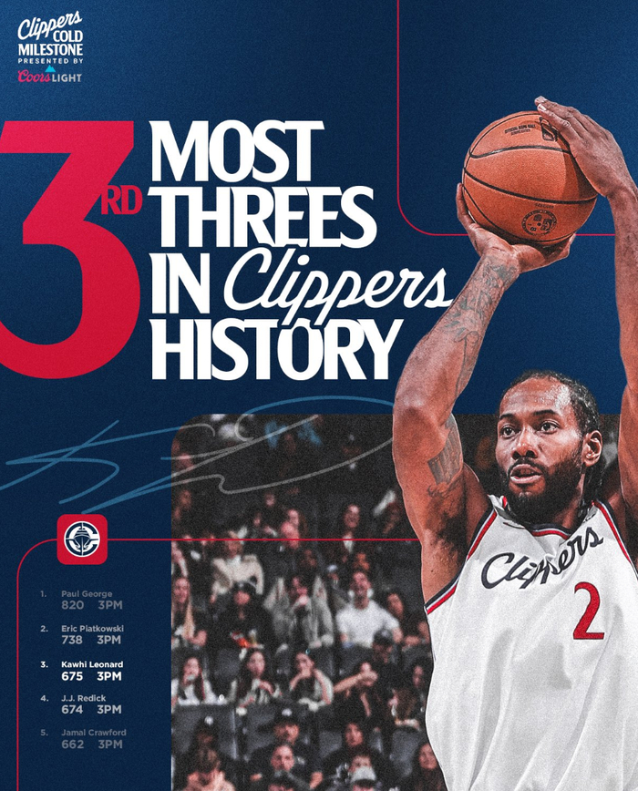 2.伦纳德完成675+三分超越雷迪克升队史第三;